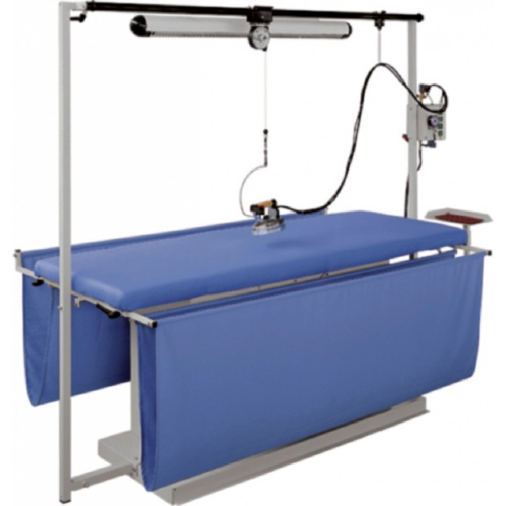 Прямоугольный утюжильный стол для глажения штор COMEL MP/F/T RU с отсосом и электрическим подогревом. Регулировка температуры стола для влажно-тепловой обработки штор при помощи термостата со встроенным отсасывающим устройством.