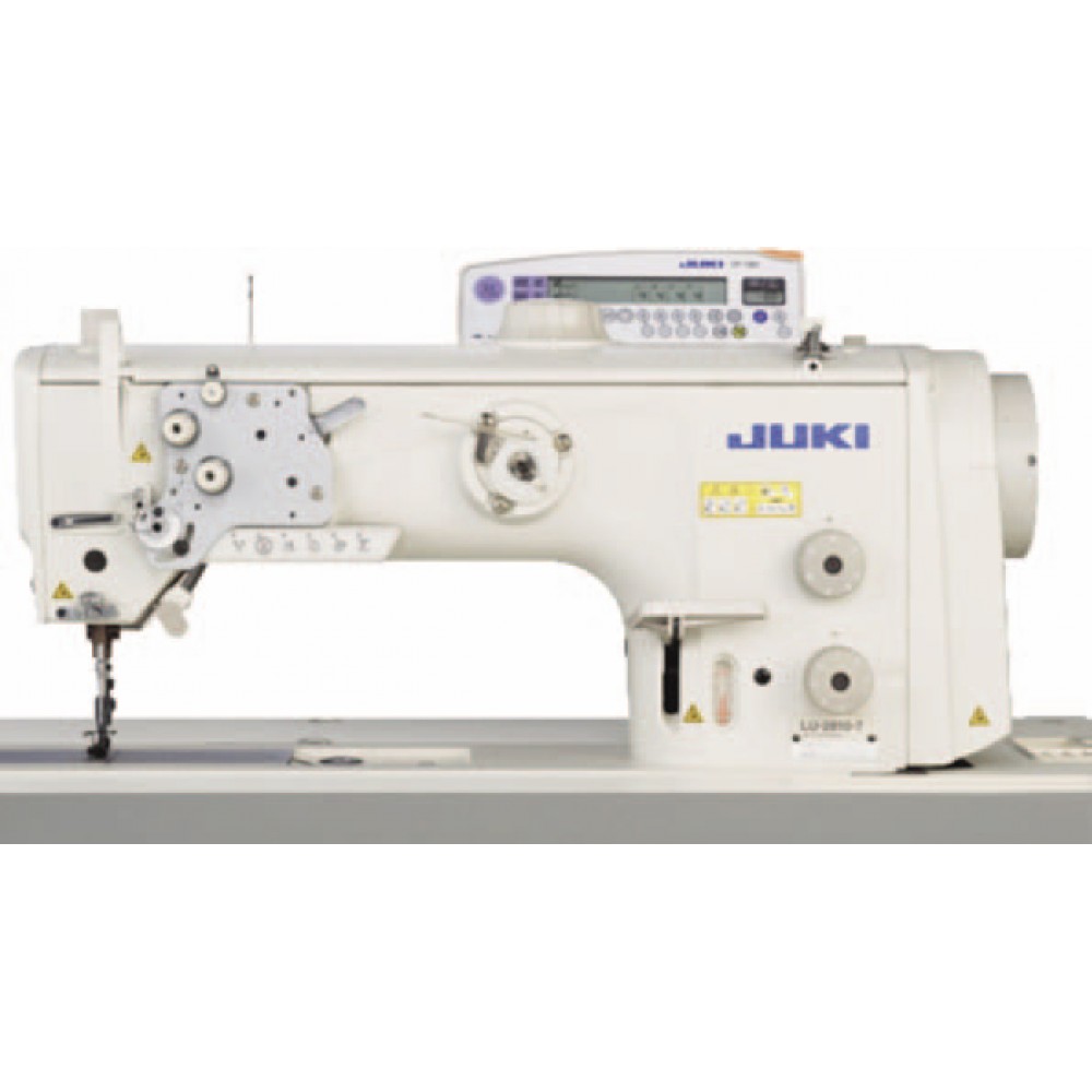 Двухигольная швейная машина челночного стежка с тройным продвижением, полусухой головой, прямым приводом, увеличенным вылетом рукава (347 ммх127 мм), увеличенным объемом челнока в 2.7 раза и автоматической обрезкой нити.