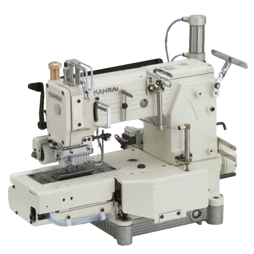 Двенадцатиигольная машина двойного цепного стежка с цилиндрической платформой (диаметр 420 мм) для настрачивания «лампасов», с пуллером.