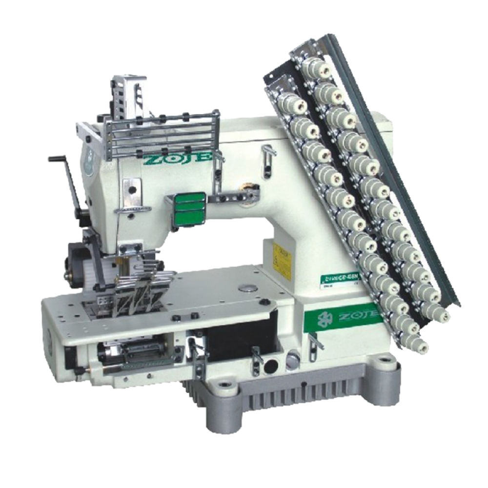 ZOJE ZJ1414-100-403-601-612-06064 6-игольная промышленная швейная машина с цилиндрической платформой двухниточного цепного стежка, с задним пулером. В комплекте с фрикционным двигателем и столом.